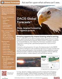 Get reliable and credible market forecast data for an array of military assets, from aircraft to manpack systems. In partnership with Tamarack Defense, DACIS Global Forecasts delivers global military equipment demand forecasting from over 70 nations including line-item detail in U.S. markets that includes new production and NRE.