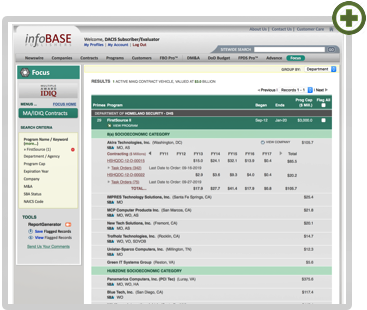With all these search tools the questions you can answer are virtually limitless. Which contractor has hauled in a quarter of the value of the money spent on the Army's Strategic Services Sourcing (S3) vehicle? On which Navy vehicles does Booz Allen have a seat? (There are 27 of them!) On which vehicles have SDVOBs found a place? And what's the (much smaller) number of vehicles on which SDVOBs are making actual money? We can tell you that.