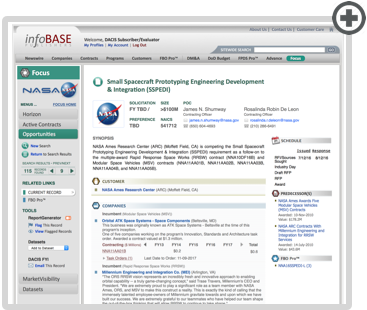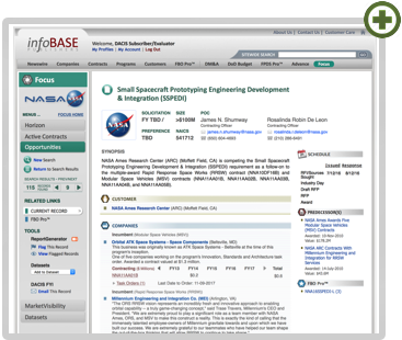 Opportunities. A curated collection of more than 110 developing opportunities in the NASA market, valued at $5 million and up. Connected with predecessor contracts, procurement documents, and InfoBase's FedBizOpps service.